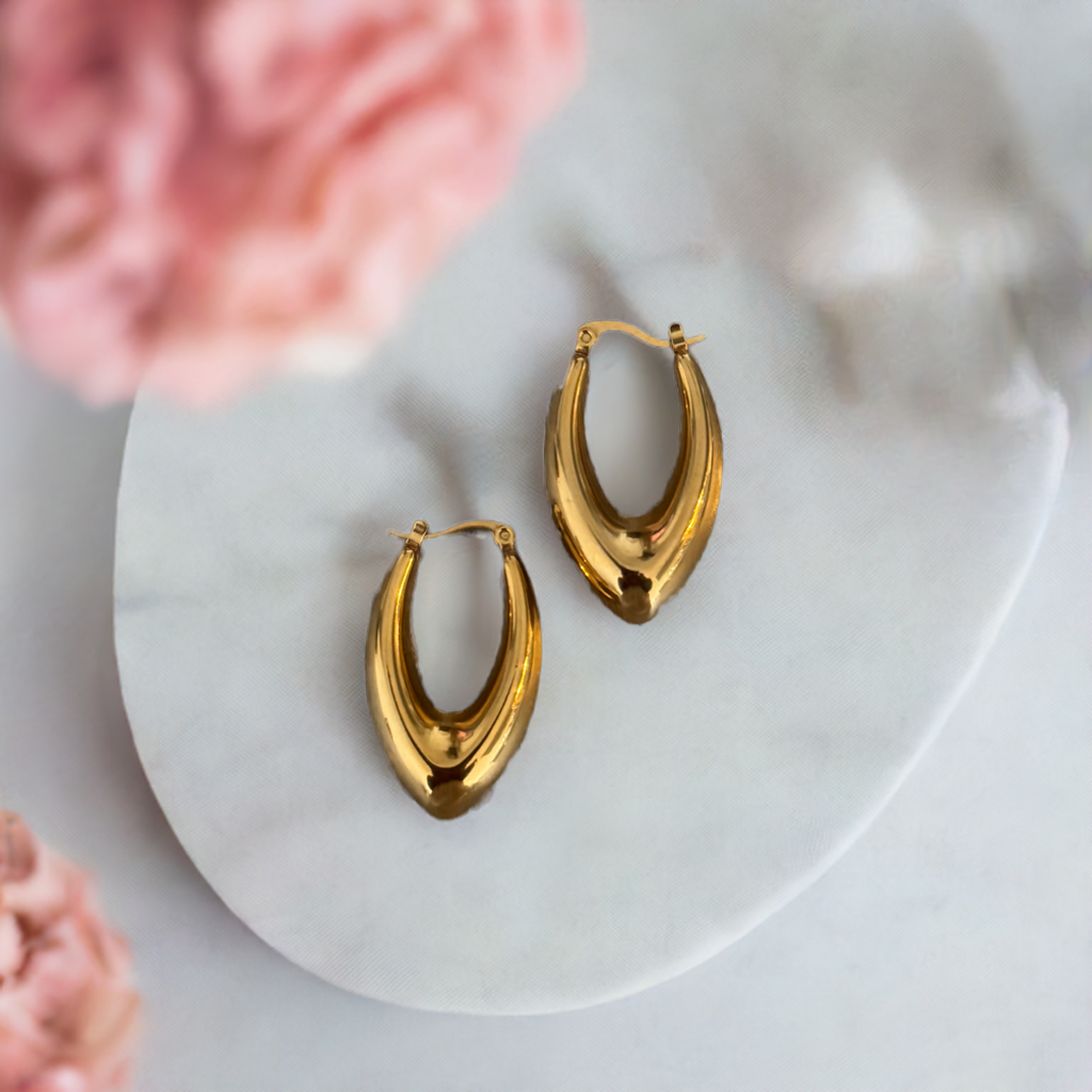 Featherlight and fluid, they move with you from morning meetings to moonlit moments. Their timeless 18k gold-plated stainless steel finish makes them a staple you’ll reach for daily, while their unique shape sets them apart in a sea of sameness.