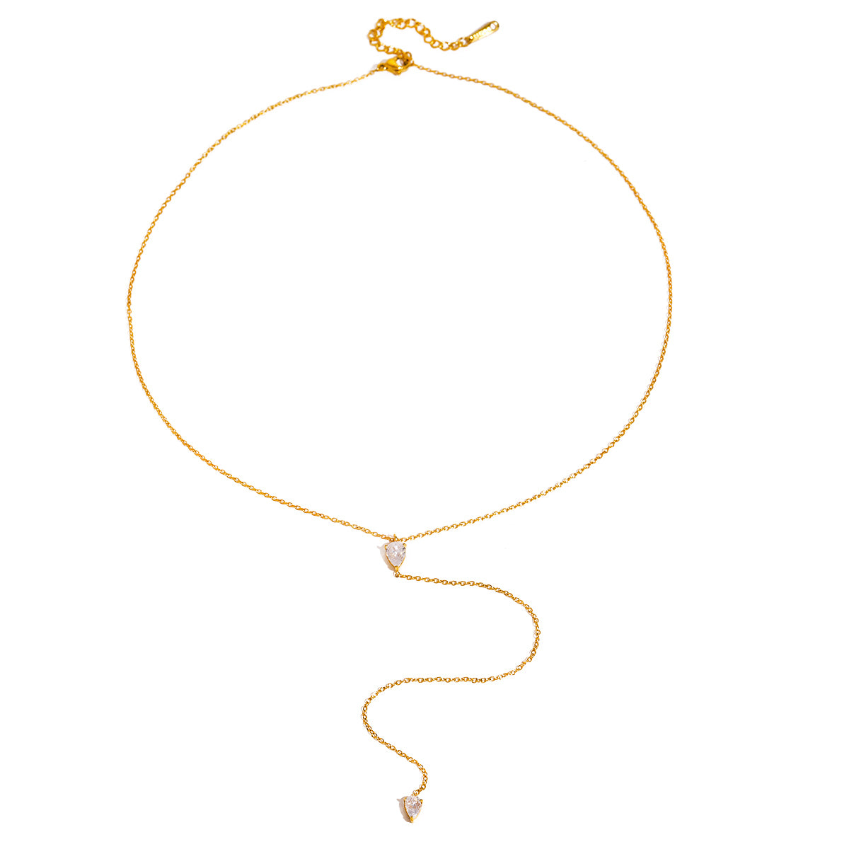 The Golden Cascade Necklace is designed to elongate and flatter, with a 13cm drop that falls gracefully to the chest for an elegant, eye-catching finish. Crafted with an 18K gold-plated chain and accented with two luminous zircon stones, this Y-shaped design captures the beauty of cascading light with every movement. Perfect as a statement piece or layered with shorter chains for a modern, luxurious look. Hypoallergenic and tarnish-resistant for everyday elegance.