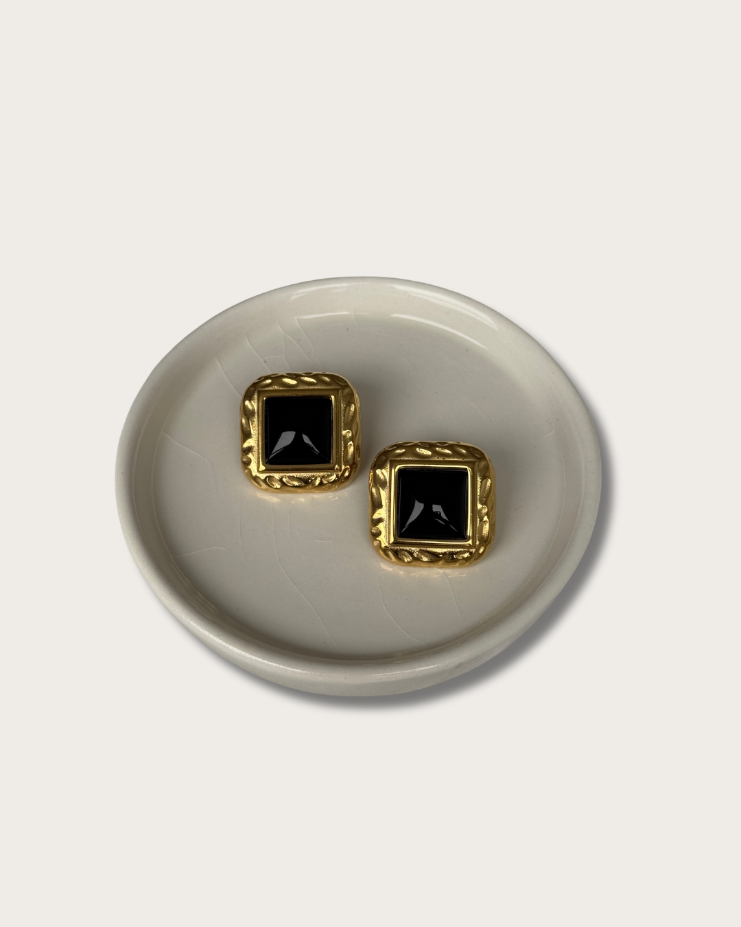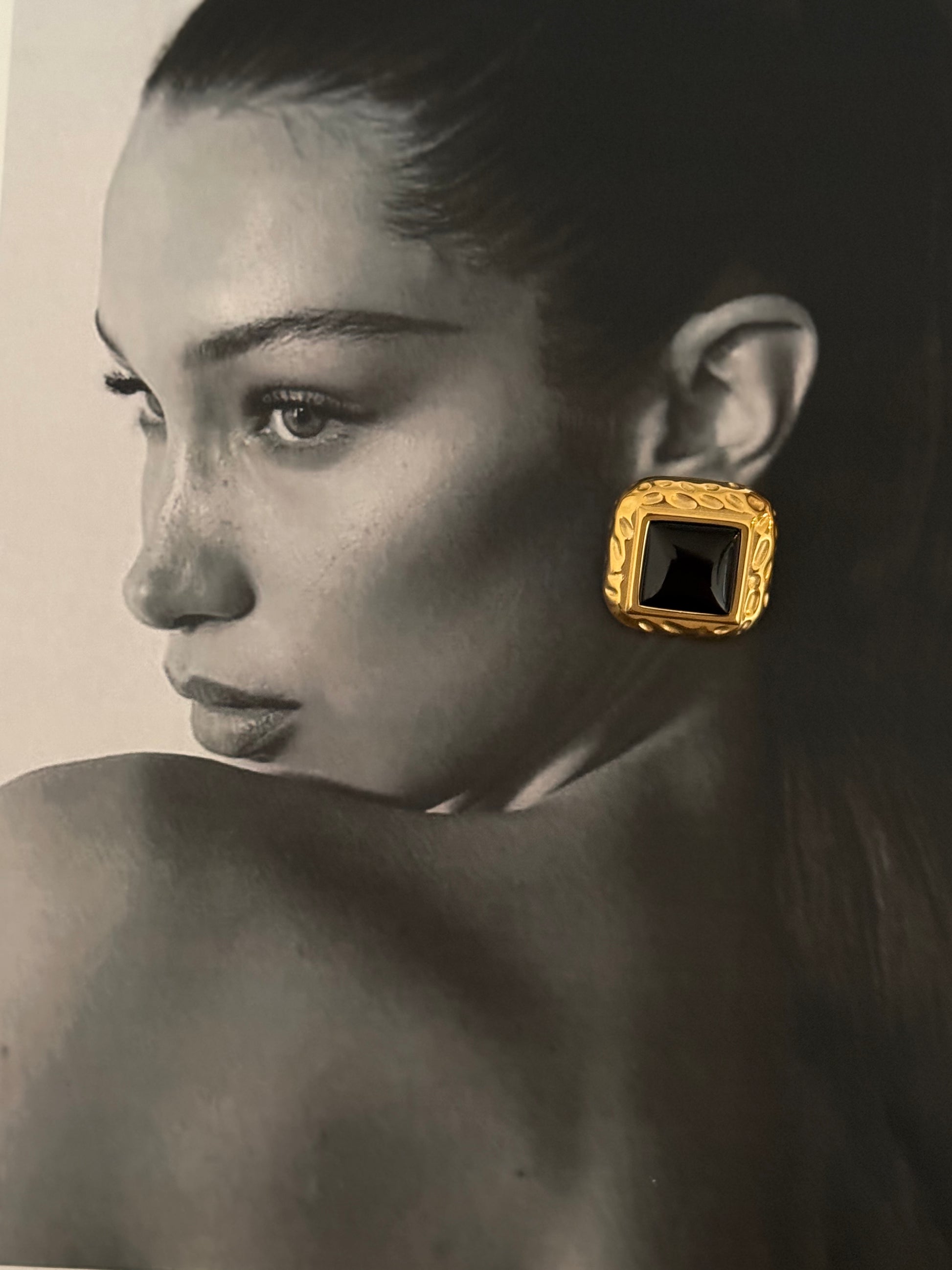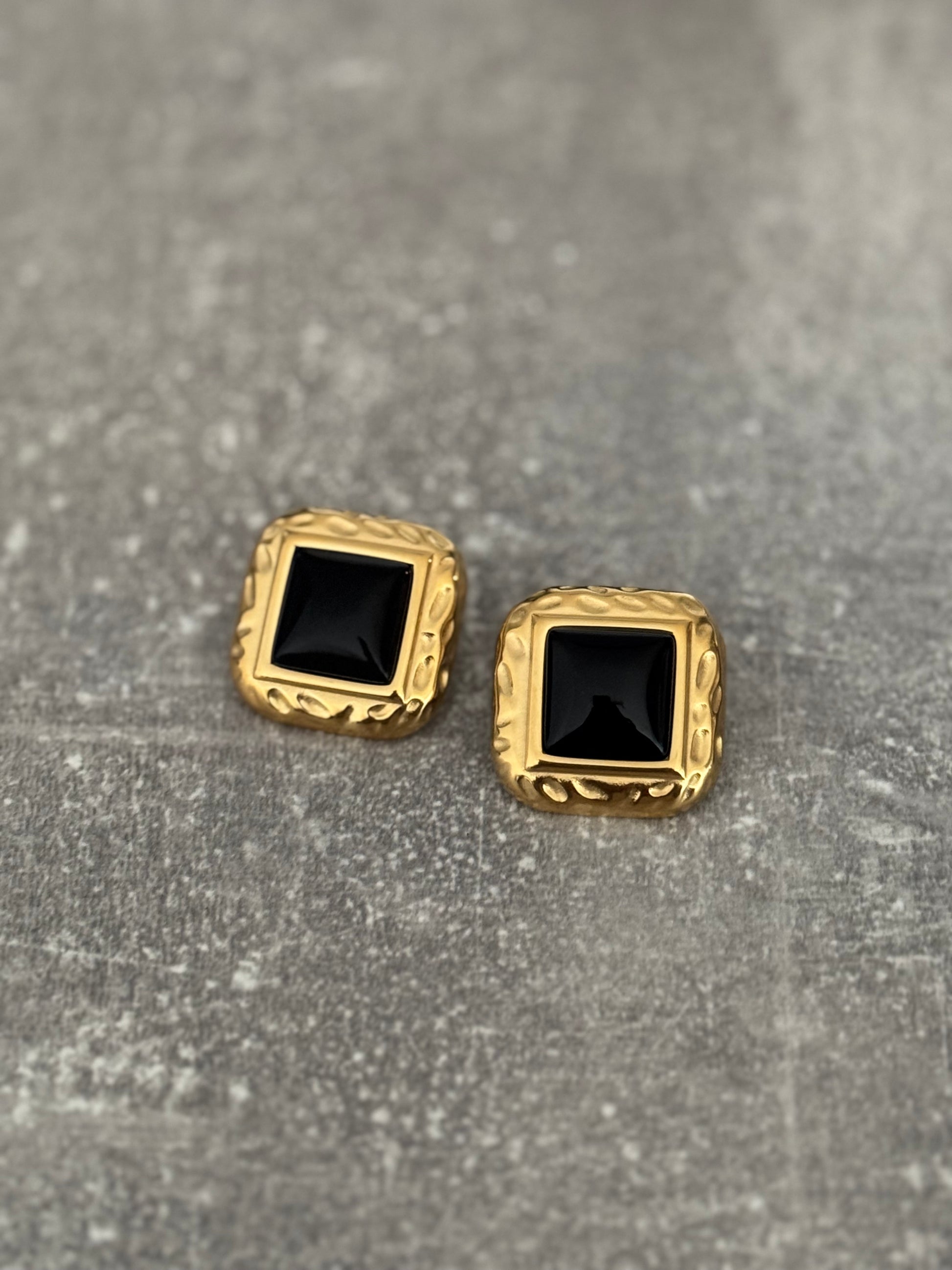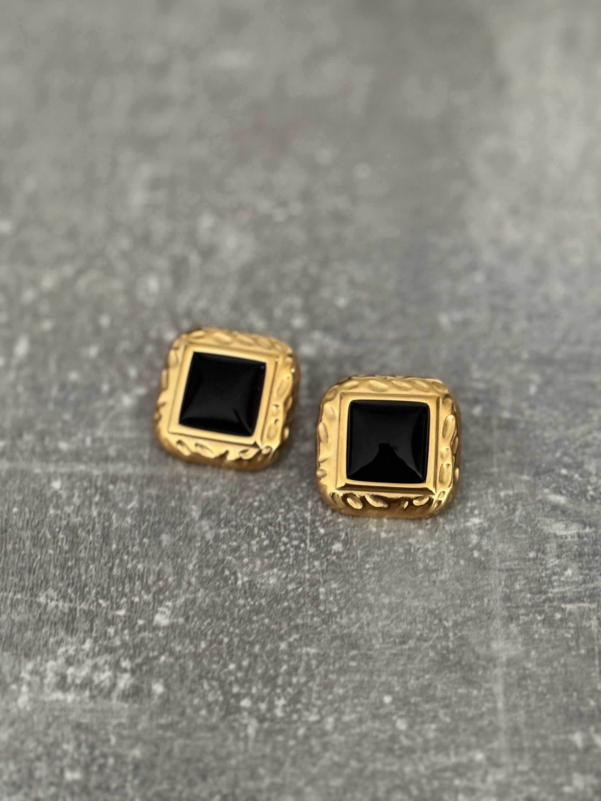 Dark, decadent, and unapologetically elegant. Noir Opulence earrings channel the mystery of midnight with the refinement of vintage gold. At their heart lies a bold, square-cut black agate stone, framed in a richly textured 18K gold-plated stainless steel setting that feels both classic and current.
