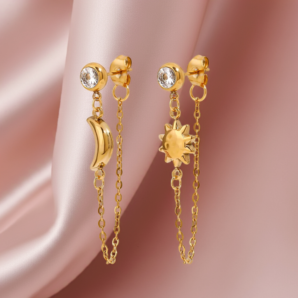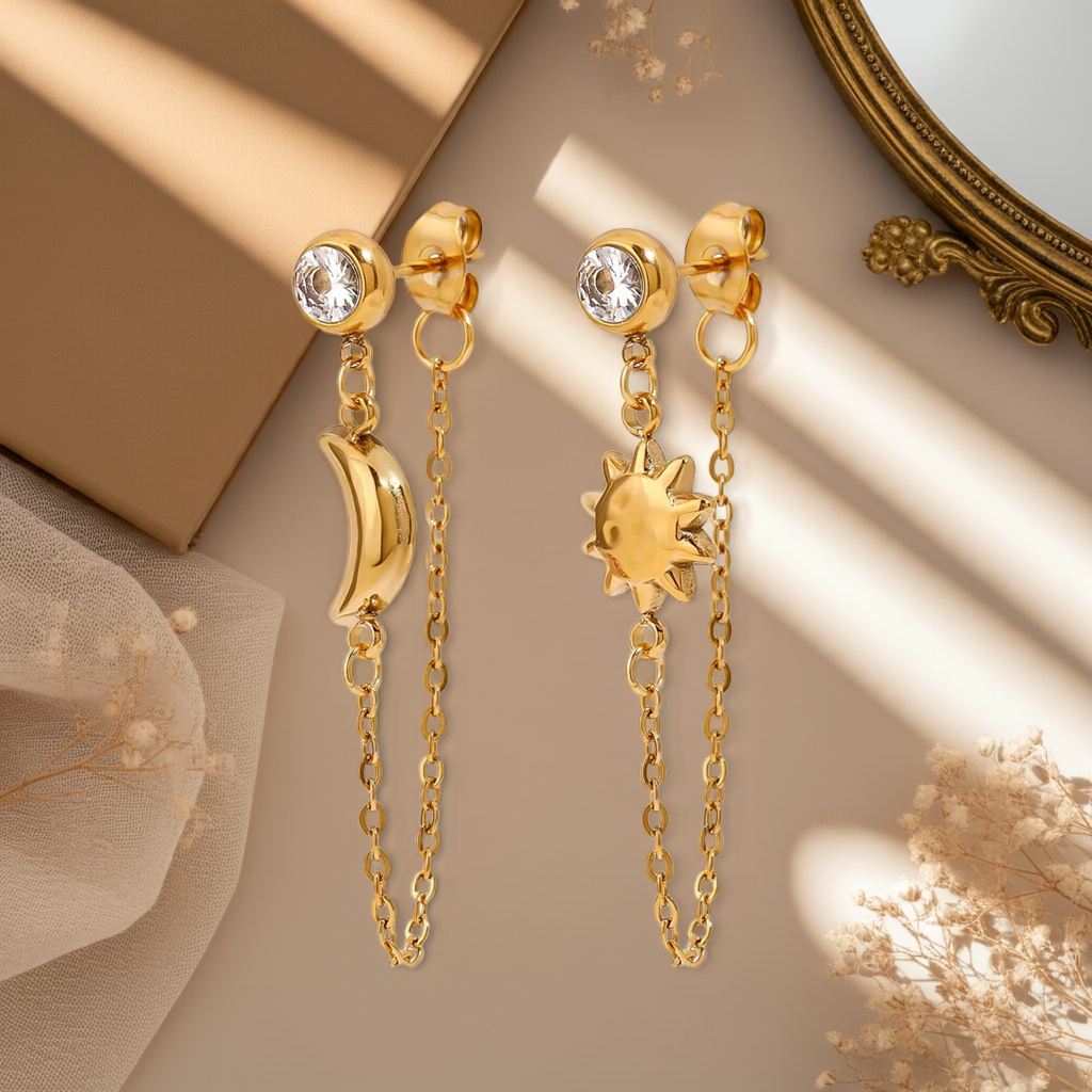 Featuring sparkling studs and delicate drop chains with sun and moon charms, they’re light, elegant, and made to turn heads. Waterproof, tarnish-resistant, and hypoallergenic — wear them every day, and let your energy speak for itself.