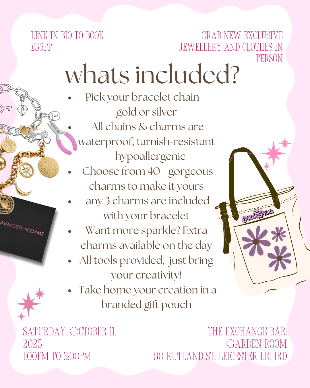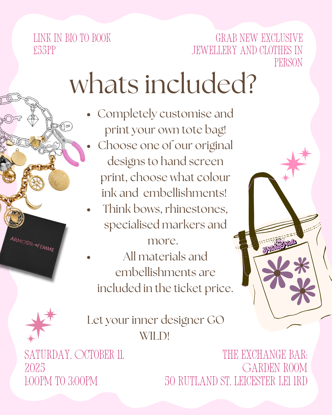 • Gold or silver bracelet chain • Choose from 40+ waterproof, tarnish-resistant, hypoallergenic charms (3 included) • Branded pouch to take home your creation • Completely customise and print your own tote bag • Select from our original designs to hand screen print • Choose your ink colour + add embellishments (bows, rhinestones, specialist markers and more) • All materials and embellishments included in the ticket price • Exclusive jewellery and clothing available in person